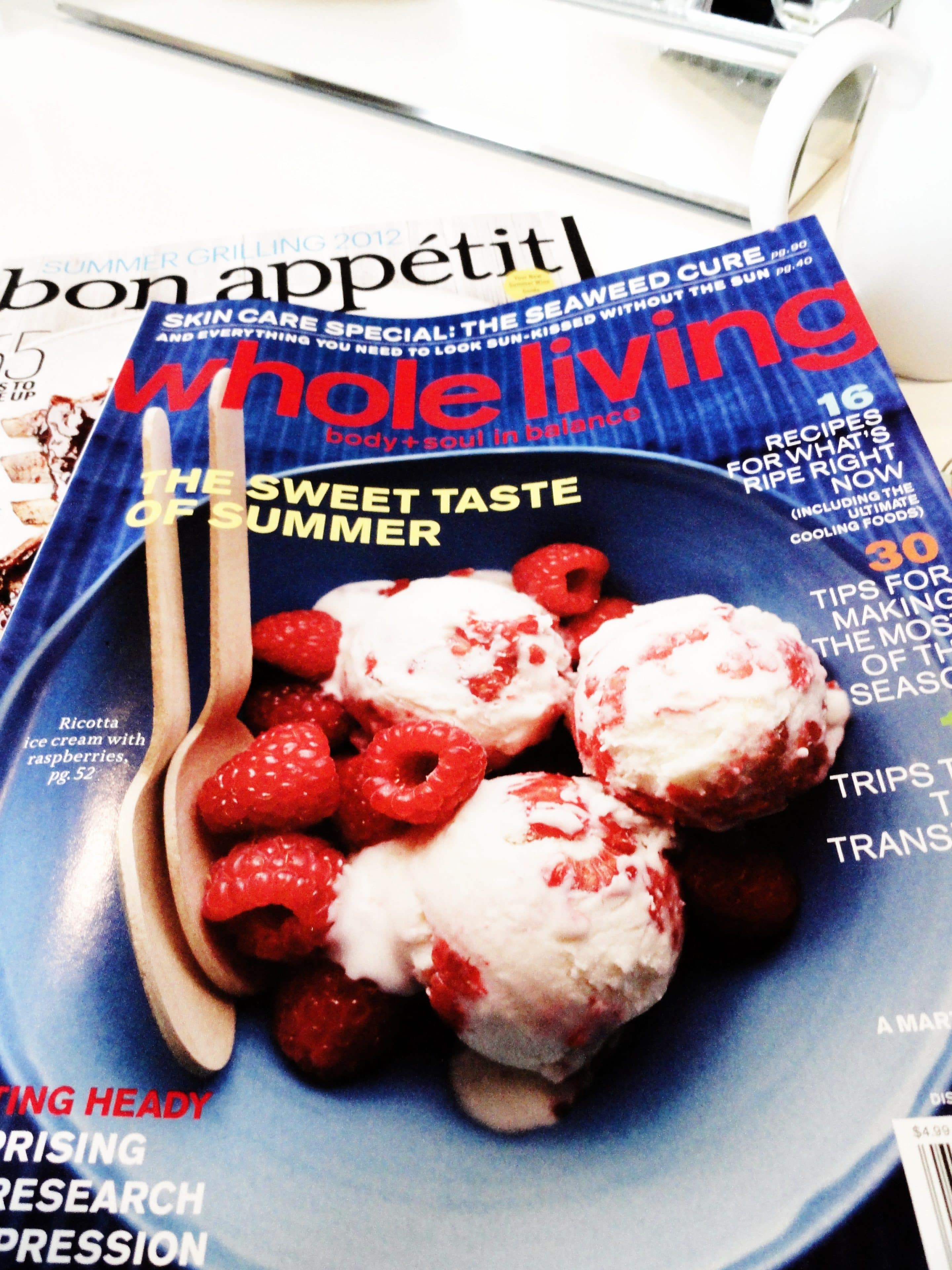 i don’t know if it was the photoshopped raspberries, the perfectly scooped spheres of ice cream, or eye-pleasing trifecta color combination of blue, red, white, the month of july, and my patriotic, beating heart wanting to feel a part of something american, but i threw down my 4 bucks, and went into fantasy mode as i scrutinized and dreamed of a world where i whisked up raspberry ricotta ice cream and creamy summer squash soup {in a bikini.}