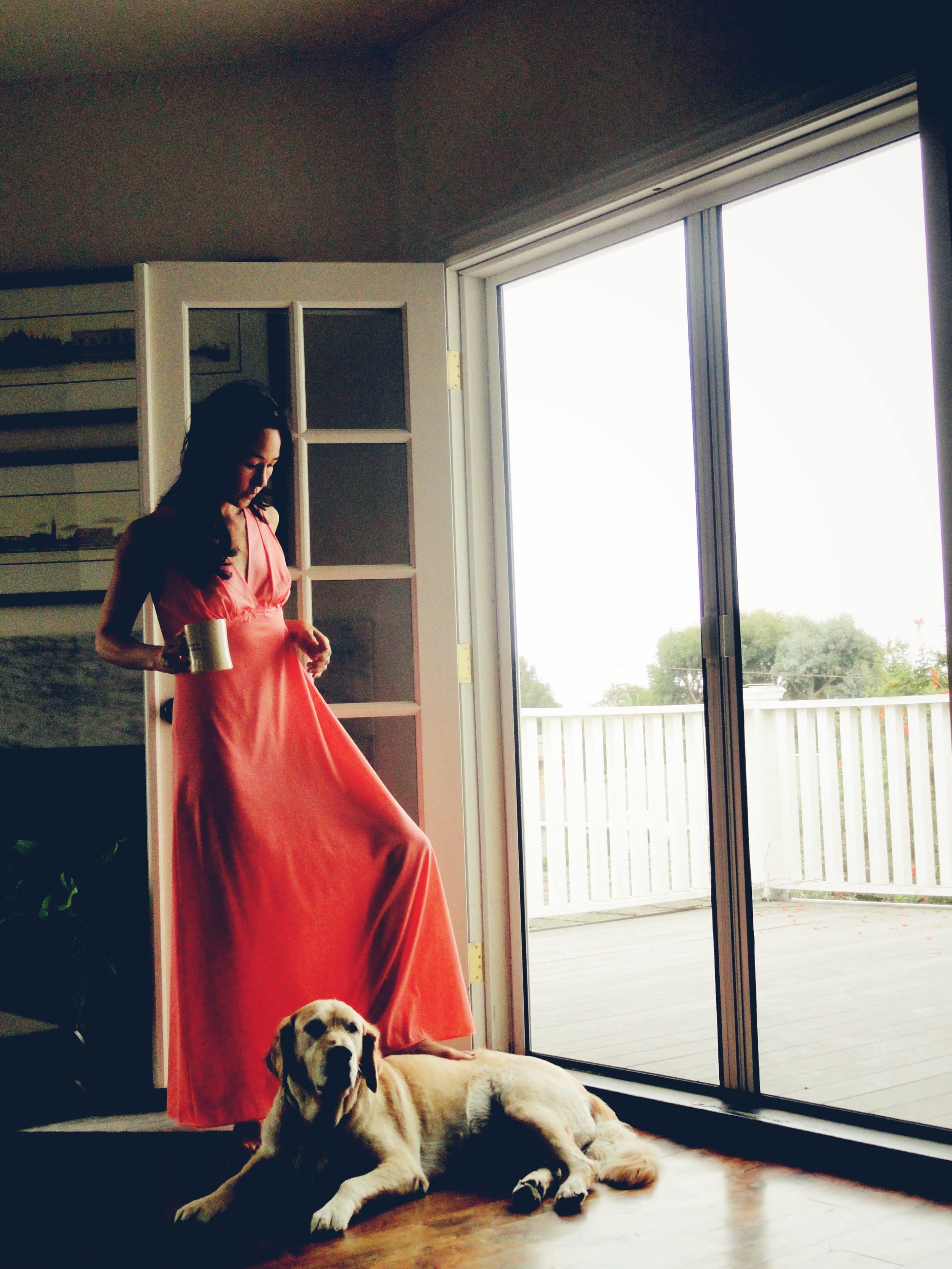 I love that…..I really do. I love the elegance & romance of it all. You look beautiful, my friend( no surprise there) and these photographs are just so lovely. Easy and beautiful. Oh, and of course I love your bowzer. What is her name again? Sigh….coffee, gowns and a doggie…perfection. I am afraid I am a comfy pj bottoms and t shirt kind of gal. And I secretly wish I had an army of these around….. http://www.toast.co.uk/product/nightwear/CHPP8/PO… yep. that would be heavenly. 🙂